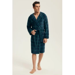 Szlafrok męski NICKEL 43373 AW25 to stylowa i funkcjonalna propozycja na chłodniejsze dni. Uszyty z miękkiego materiału w modną kratę, łączy wygodę domowego outfitu z ponadczasowym, męskim designem. Wyposażony w praktyczny kaptur, wiązanie w pasie oraz duże kieszenie, sprawdzi się doskonale zarówno po kąpieli, jak i podczas porannego relaksu z kawą. Klasyczna kolorystyka w odcieniach granatu i zieleni sprawia, że model prezentuje się elegancko, a zarazem swobodnie.