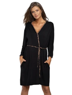 Čierne elegantné negližé zdobené jemnou čipkou. Až budete mať večer chuť dokonale dotvoriť svoj vzhľad, siahnite po tomto modeli. Čipka s jemným kvetinovým vzorom. Opasok v páse, ktorý zvýrazní váš pás. Rukávy v dĺžke k lakťom. Ideálne aj na rannú kávu.