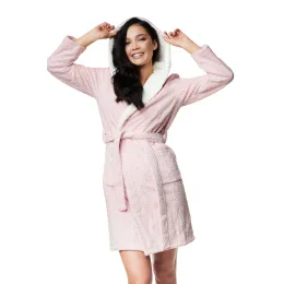 Krátky hrejivý dámsky župan zdobený jemným reliéfnym vzorom. Je vyrobená z látky príjemnej na dotyk a bude ideálna pre prvé chladné večery. Celok v jemných farbách. Kapucňa lemovaná bielou kožušinou, ktorá prechádza aj na vnútornú stranu výstrihu. Opasok elegantne zvýrazňuje pás. Dve vrecká na bokoch.