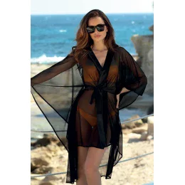 Čierne negližé z polopriesvitného tylu, zmyselného, veľmi ženského strihu, ktoré vám môže poslúžiť ako prvok nočnej bielizne aj ako negližé na pláž, ako doplnok plaviek. Je vzdušný, jemný, pružný a príjemný na dotyk. Výstrih je lemovaný saténom.